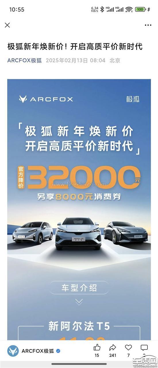 2025年1月23日购车,当时厂家官方优惠32000。2025年1月23日提车20天后,2025年2月13日,厂家官方优惠32000+8000,额外优惠8千,背刺老车主,购车仅二十余天就降价了,没有任何补偿。这还是厂家直接给的优惠,跟4s店没关系。