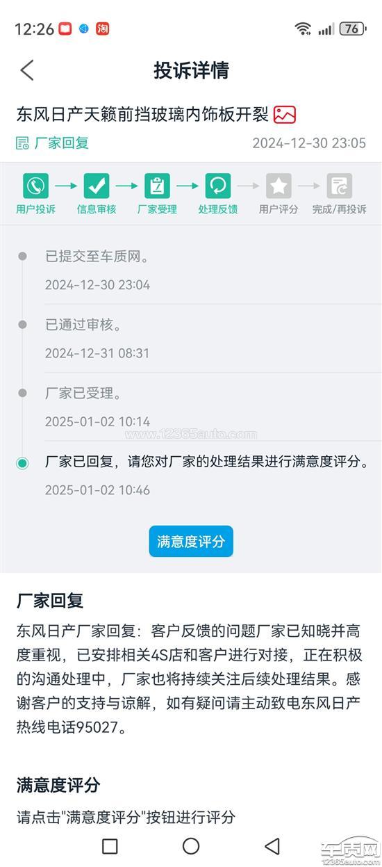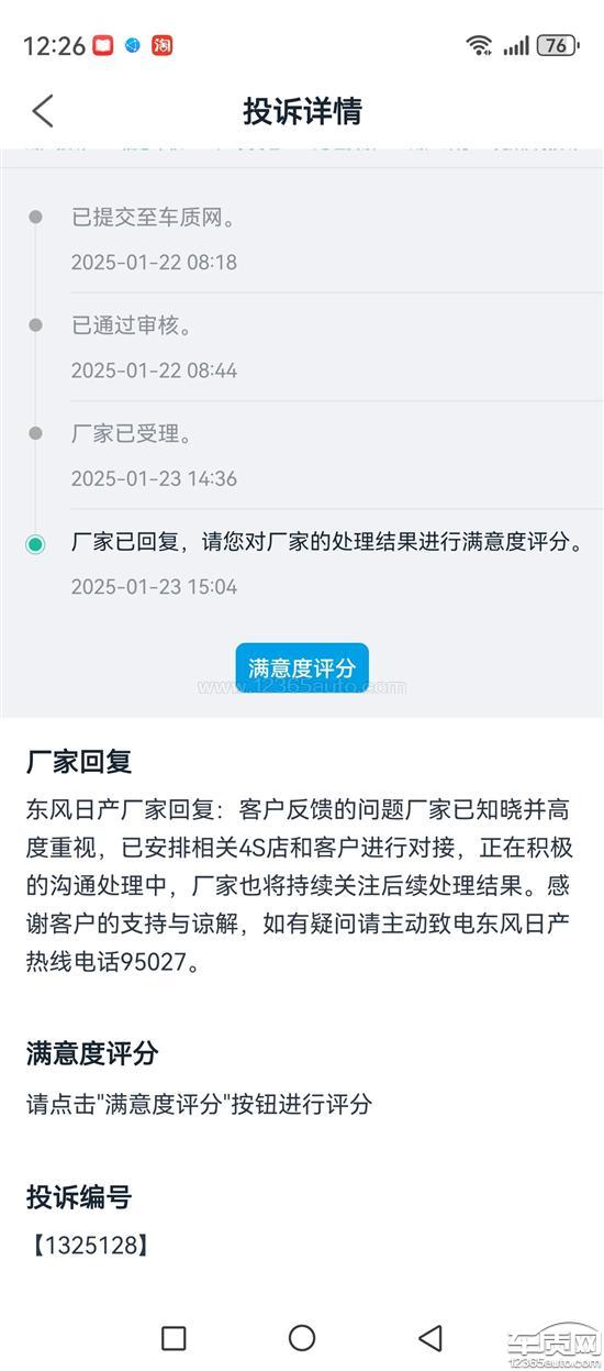 厂家回复:厂家已知晓并高度重视,已安排相关4s店与客户沟通,并在积极的处理中,厂家将持续关注后续处理结果。3个多月来,我多次反映问题,厂家回复一个字不差,就是复制粘贴的回复。4s店至今没有打一个电话。我联系到4s店售后服务,他们说这是出厂前出现的问题,他们不当家,他们等待厂家处理方案,我说,车质网上厂家回复已安排4s店处理此事,他们回复说,给厂家汇报一下看怎么处理,厂家对投诉回复怪积极,厂家推脱4s店,4s店推脱厂家,相互推脱就是不处理问题,各位客户看清东风日产天籁厂家的产品质量和处事态度,在以后购车时不要上当受骗,他们拖延处理问题耍无赖的态度,以免给自己造成不必要的麻烦。东风日产天籁厂家真是个无赖,把车卖吧,只要收到钱,就是有问题也不承认,就是拖着你,光回复,网上看着态度怪好,实际上就是车卖出去就不管啦,说是让4s店联系,4s店也没有打过电话。