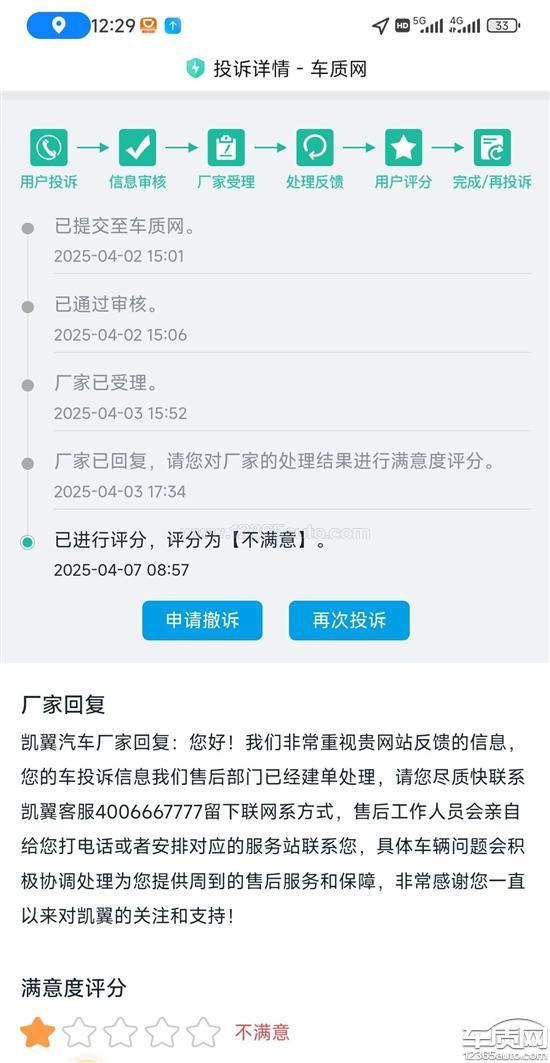 车辆后保险杠存在销售时的二次喷漆,销售时候未告知,是否存在欺骗行为,是否存在返修,服务站8月24号反馈厂家,服务站姜师傅称厂家承认有二次喷漆,多次拨打400电话厂家一直没和我联系,2次反馈该网站就是这么回复,跟本没有给我联系过,这是不是店大欺客,购买的凯翼拾月新能源汽车太让我失望了,质量售后跟不上啊。