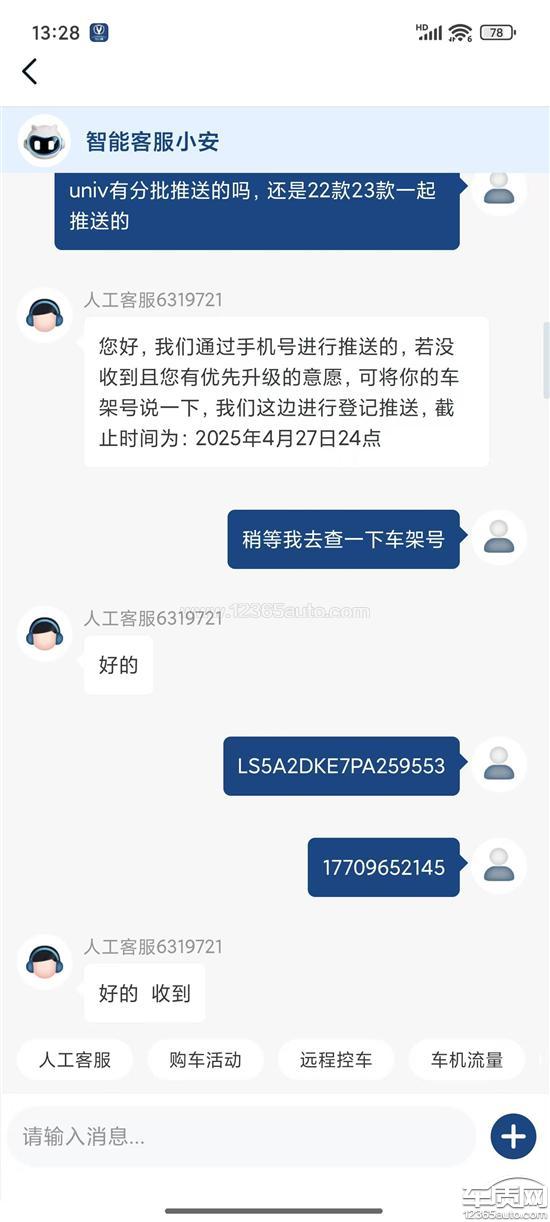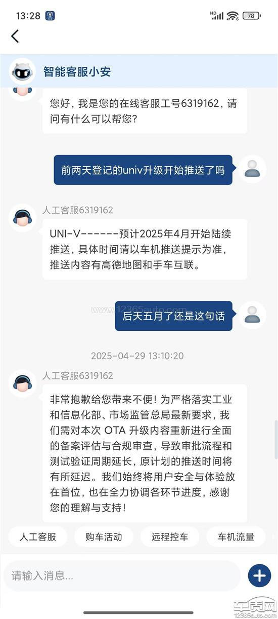 购买时承诺终身免费OTA升级,23款24款UNIv都有推送升级版本,22款厂家一直推脱不更新,背刺老车主,前期承诺的今年4月推送新版本现在快5月还没有任何动静,联系客服敷衍,服务态度差,联系4s店被告知需要厂家推送,两边踢皮球,要求厂家尽快立马推送新版本,否则给22款老车主补偿。