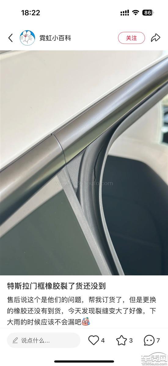 特斯拉Model Y右侧车门密封胶条开裂