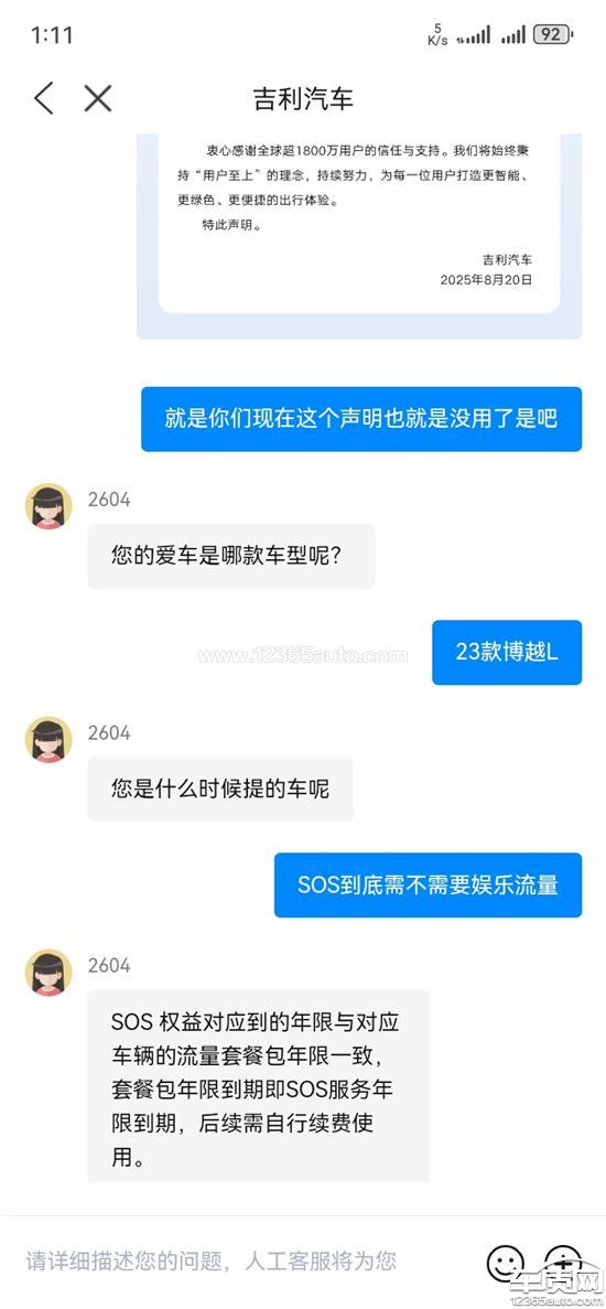 吉利博越L SOS服务后续需自行续费使用