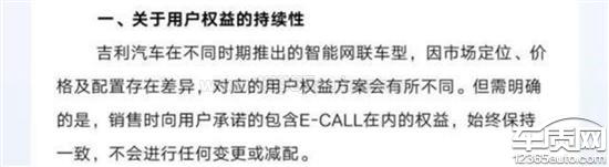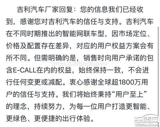 购车时所讲的是道路救援功能属基础流量永久免费,而厂家回复的“销售时向用户承诺的包含E-CALL在内的权益,始终保持一致,不会进行任何变更或减配。”厂家在回复里挖坑,根本没有提及使用时间,实际厂家政策是把道路救援跟随了娱乐流量,娱乐流量到期SOS就失效,需要买整年的娱乐流量才能使用,完全没有诚信,一直靠糊弄靠骗来坑这些老车主。