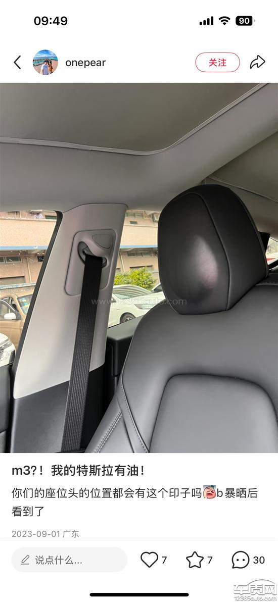 特斯拉Model Y副驾驶头枕暴晒表层出油