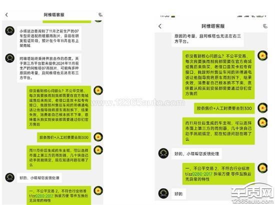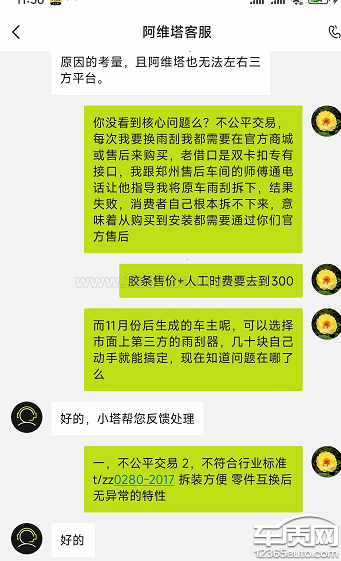 公平交易权受损:因接口特殊,市面上第三方雨刮器均无法适配,我被迫只能在4S店更换雨刮,胶条+工时费高达300元/次;而11月后生产的车主,可自由选择几十元的第三方雨刮,自己动手就能更换,这种“区别对待”让我承受额外经济成本与不便。自主选择权、知情权被侵犯:购车时厂家未告知雨刮接口为非通用设计,后续也未说明同车型会更换通用接口。且雨刮拆装难度大,我按售后指导尝试自行拆卸失败,从购买到安装全流程被“绑定”在官方售后,完全失去自主选择维修方案的权利。违反行业标准:依据行业标准T/ZZB0280-2017,雨刮器应具备“拆装方便、零件互换后无异常”特性,但阿维塔07老接口设计明显不满足,产品设计与服务存在缺陷。二、诉求恳请平台监督处理,要求阿维塔:为我的车辆更换通用接口雨刮总成,消除配件适配歧视;赔偿因不合理高价售后产生的费用(如有),并承诺后续维修、配件供应的公平性;就未履行告知义务、设计缺陷问题,公开说明并改进,保障消费者合法权益。