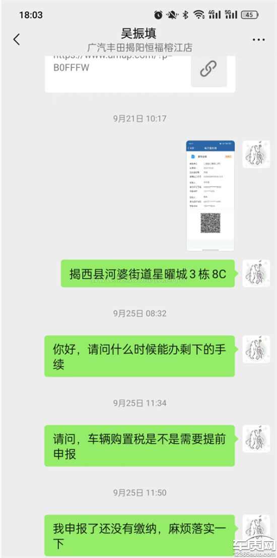 本人于2025年09月15日购买新车威兰达两驱2.0L都市版汽车一辆,在询问到有白色现车前提下,当天签订合同并全款购买,销售承诺2025年09月21日(周日)可以提车,于是当月21日前往店内提车,销售简单交代后和办理常规手续后,交车时候未向车主提交车辆合格证、一致性证明、购车发票与合同等任何纸质及其他相关必要证件,即告知本人可以提走车辆,后电话联系还需要到时候去车管所拍张照片即可上牌,其他流程不用我们操心,回到家后一直没有上牌通知消息告知,全程车主一问,销售一答,车主不问,销售没有任何时间提醒,因工作繁忙,多次提醒尽量当月25号(周四)去完成上牌,后销售不再正面回答时间问题,直到25号当天询问,销售说需本月29(周一)去揭阳渔湖验车并拍照,而且在15日-25日10天时间内,广汽丰田店仍未缴纳车辆购置税,未在此期间提醒车主任何未验车需注意事项,在此期间,因车主不了解上牌流程,已进行车辆贴防晒膜处理,后却被告知需撕掉玻璃膜并验车,验车地点位于揭阳渔湖,没有就近安排揭西本地车管所验车,销售购车后全程沟通不完善、态度敷衍,再此提出是疑问,第一,作为卖家,有权向客户提醒未验车前需要注意事项,导致