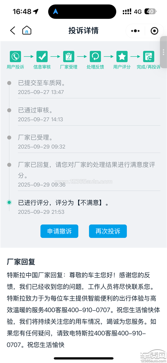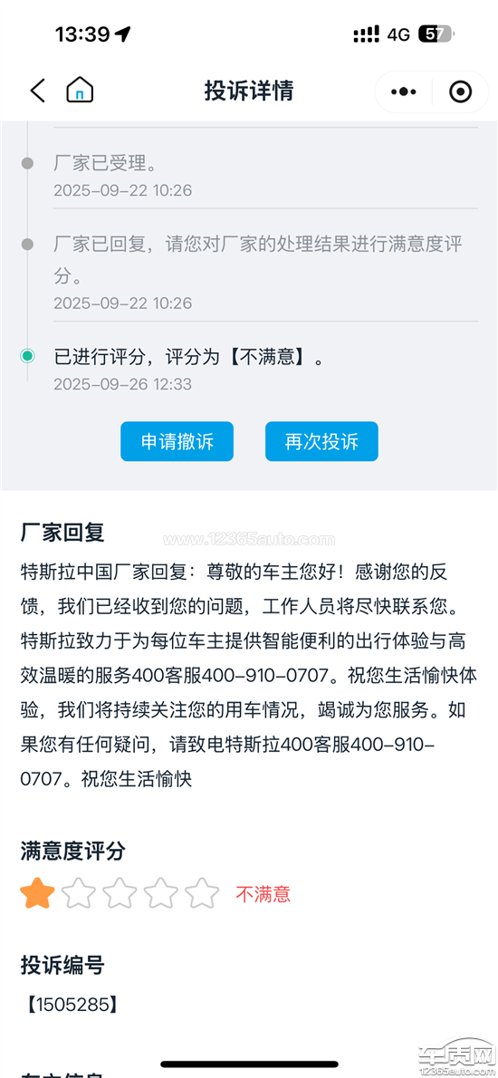 1.本人于2025年9月20日在车质网上传相关质量投诉,后于9月22日查看进度,收到车质网平台上显示的厂家回复〈号称会有相关工作人员尽快联系我〉,直至9月27日再次投诉时,仍未有任何工作人员联系我,故再次投诉;