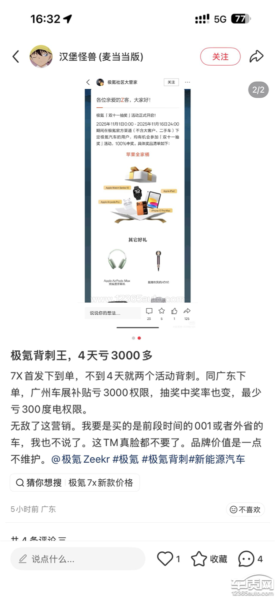 本人于2025年10月28日“极氪7X”车型发布并开启大定当日,即支付大定定金,成为该车型的首批车主。然而,极氪官方后续推出的促销政策,对在不同时间点下定的车主实行了显失公平的区别对待:1.针对11月1日起下定的车主:提供了“保底300度电卡”的抽奖权益。2.针对11月3日起下定的车主:权益进一步升级,直接赠送“20000积分”和“1000度电卡”。3.而作为10月28日(包括本人在内的)首批大定车主:却无法享受上述任何一项新增权益。此种“早定吃亏、晚定享优惠”的营销策略,对首批支持该车型的消费者构成了严重的不公平对待,损害了我们的合法权益。极氪的上述行为,涉嫌违反以下消费者权益保护及相关促销规范的法律法规:1.《规范促销行为暂行规定》第五条:经营者开展促销活动,应当真实准确,清晰醒目标示活动信息,不得利用虚假商业信息、虚构交易或者评价等方式作虚假或者引人误解的商业宣传,欺骗、误导消费者。极氪在短期内连续推出差异巨大的优惠方案,但其宣传中并未对首批车主可能面临的价格或权益变动风险进行充分、清晰的提示,其行为可能对消费者构成误导。2.《规范促销行为暂行规定》第六条:经营者通过商业广告、产