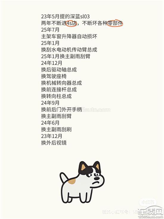 23年5月提的深蓝sl03两年不断进4s店,不断坏各种零部件。25年7月主驾车窗升降器自动损坏。25年1月换刮水电动机传动臂总成。25年1月换主副雨刮臂。24年12月换后驱动轴总成换驾驶座椅换机械转向器总成换前连接杆总成换转向柱总成。24年9月换前后门外开手柄换主副雨刮臂。24年6月换主副雨刮刷23年12月换外后视镜。