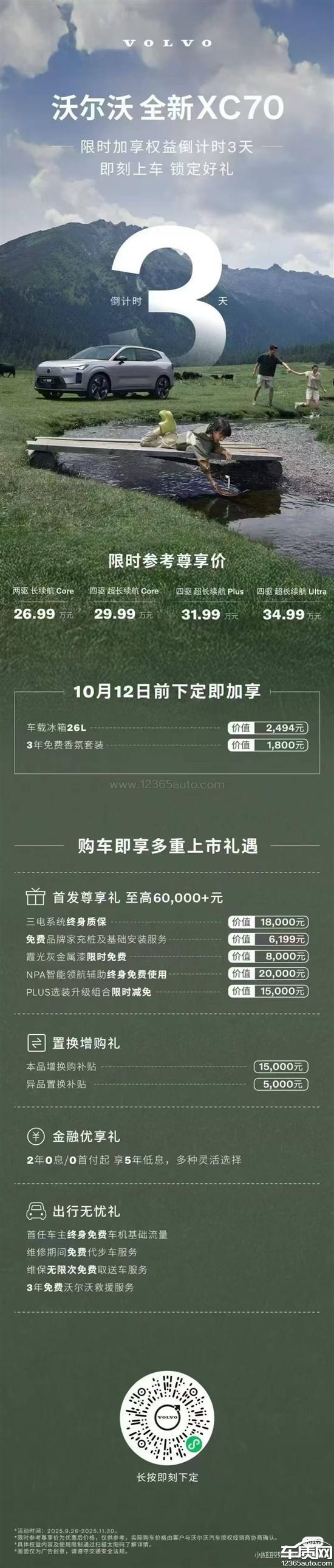 3:销售问题:9月底沃尔沃XC70车辆首发,厂家及4s店工作人员宣传首发权益及优惠政策最大,政策持续到11月30日,首发购车不送保养,购车异品置换只有5000元,截止到10月31日,大批首发车主刚提车。11月1日,厂家以双十一活动为由,突然变更政策,直接将所有的车送终身免费保养,而且异品置换变成了15000元,已提车、未提车的客户不享受该政策,与宣传的首发政策持续到11月30日严重不符,导致首发车主加起来亏了两三万,与沃尔沃公司多轮沟通投诉无果。虚假宣传误导消费者使消费者遭受经济损失,要求厂家补全权益且现金补偿。