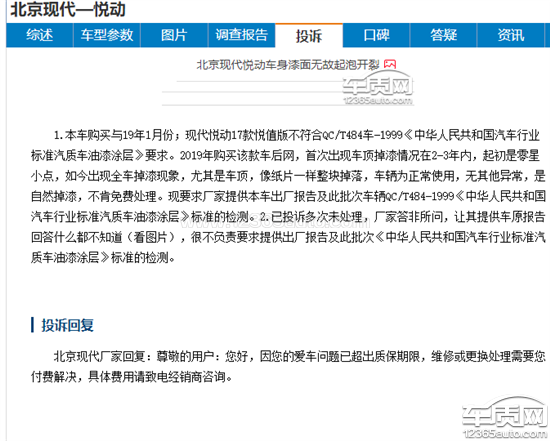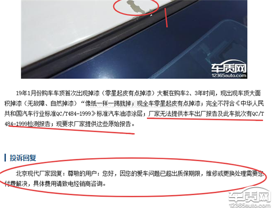 1.本车购买与19年1月份;现代悦动17款悦值版不符合QC/T484车-1999《中华人民共和国汽车行业标准汽质车油漆涂层》要求。2019年购买该款车后网,首次出现车顶掉漆情况在2-3年内,起初是零星小点,如今出现全车掉漆现象,尤其是车顶,像纸片一样整块掉落,车辆为正常使用,无其他异常,是自然掉漆,不肯免费处理。现要求厂家提供本车出厂报告及此批次车辆QC/T484-1999《中华人民共和国汽车行业标准汽质车油漆涂层》标准的检测。2.已投诉多次未处理,厂家答非所问,就不愿处理;让其提供车原报告回答什么都不知道。请提供出厂报告。