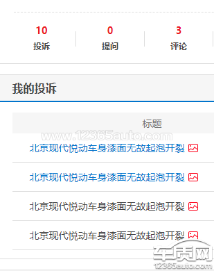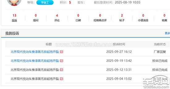 北京现代悦动车身漆面无故起泡开裂