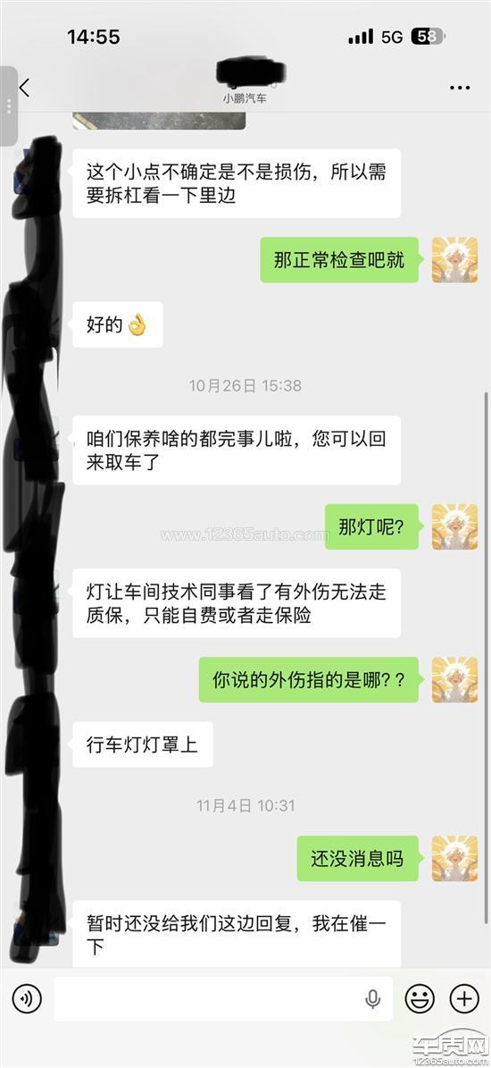 车辆右前行车灯不亮有水雾,于10月26日进店检测维修,小鹏售后人员维修途中两次询问是否拆卸保险杠检测,均已告知同意进行正常检测,最后告知因行车灯有外伤不予质保,行车灯有裂纹保险杠划伤。门店售后说与厂家协商等待半个月无果,通过多次12345投诉,通州质量监管局告知,当天并未拆杠进行检测,现场已留存录音,现在小鹏厂家400也进行过多次投诉要求门店反馈是否进行拆杠检测,但没得到通州小鹏售后及厂家任何有效回答。