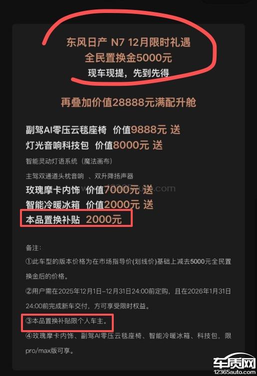 本人于25年7月在苏州购买一台日产N7,购车前反复询问销售希望能给一些优惠,销售反应为厂家统一定价,永远不会有任何现金优惠。于22日提车后,仅仅过去8天,现在官方小程序优惠5000元现金,询问销售后反复扯皮,一会说是厂家促销他们没法干预,一会说这5000是要置换才有,一会说公司牌不参加这次活动。实际app中写的不需要置换旧车,只需要提供任何一张旧车行驶证,并且如图显示,公司牌同样参加本次活动,下单立减5000元,并且宣传图片明确写了只有2000元的本品置换限制个人车主。4s店毫无信誉可言,当时承诺提车后配合各个平台宣传可返1万积分,提车的时候却说现在活动结束,只有4000积分可返了。这个时候不以下单时间为准了,那凭什么这次5000优惠又要以下单时间为准?你们想怎么解释就怎么解释,消费者权益谁来维护?