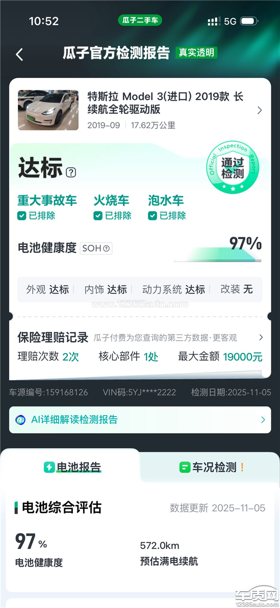 于2025年11月6日从瓜子二手车下订单购买特斯拉车,同年11月9日付尾款现场交车,以虚假检测报告隐瞒欺诈消费者,电池健康度检测报告虚构97%电池健康度,同年12月2日官方检测为82%健康度。要求退一赔三