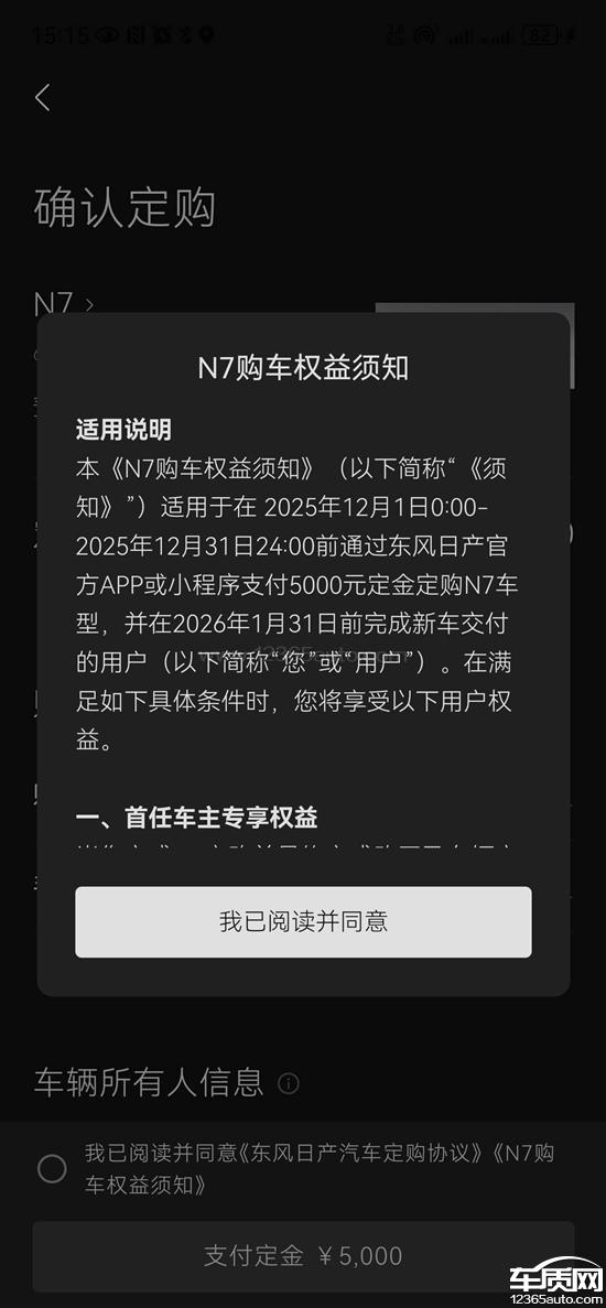本人于2025年11月27日在4S店订购了一台N7新能源轿车。购车前曾多次向销售人员咨询厂家近期优惠活动及现金优惠,销售人员表示该车型为厂家统一定价,年底无降价及活动通知,目前仅提供置换补贴,需将旧车出售给4S店方可享受。当晚发现该车型官网直降5000元,遂向店内销售人员反馈,但目前店内与厂家相互推诿。消费者权益无人维护,当日降价也未处理或通知客户。希望车质网能帮助消费者讨回公道!