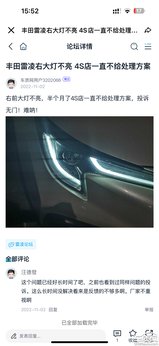 广汽丰田2022款雷凌运动版购买时间:2022年08月故障描述:车辆无外力撞击、无浸泡,无出险,日常仅市区行驶(极少使用大灯),近期4S店保养时发现右侧的前大灯+后尾灯均不亮,故障大概率在质保期内已发生,仅因使用场景未及时发现。关键依据:通过懂车帝、汽车之家等车主论坛了解到,22款雷凌运动版车灯存在设计缺陷,多名车主反馈同类无外力损坏问题,属于共性故障。此前维权情况:向4s店和400厂家投诉,已过质保期3个月为由拒绝处理,已同步向广州地投诉。诉求:要求厂家正视车灯共性设计缺陷,免费更换故障大灯及尾灯,或提供合理的售后处理方案。