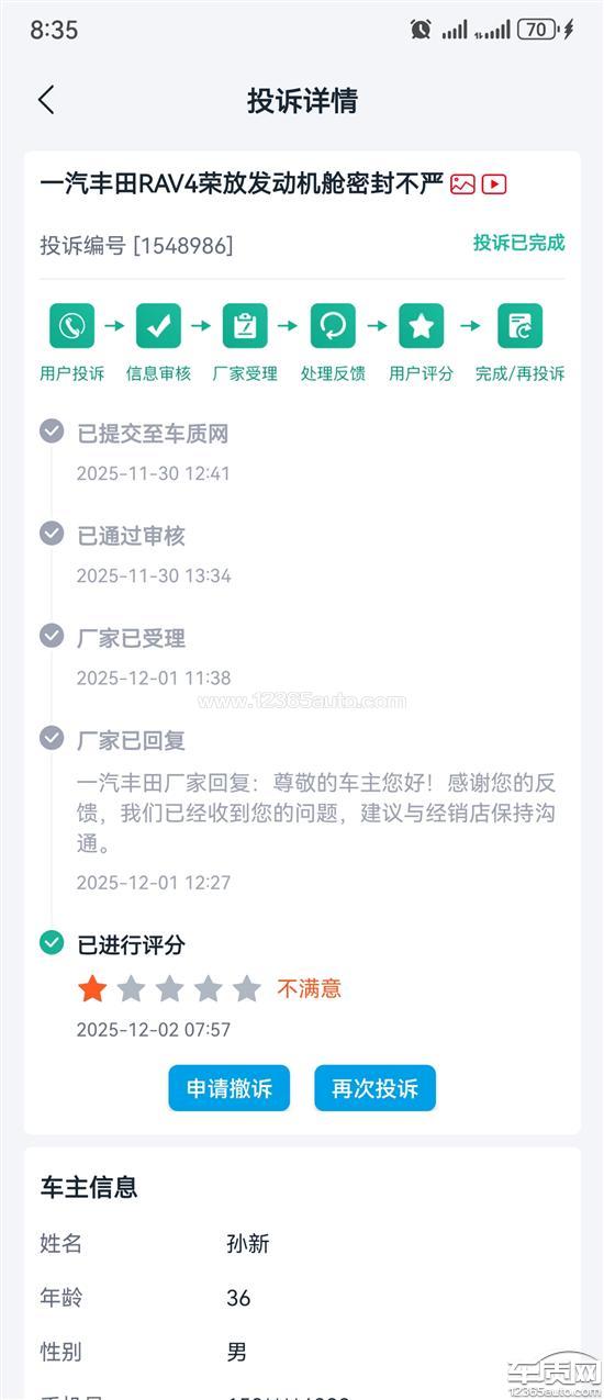 投诉车款:2020款RAV4荣放2.0L CVT两驱风尚版