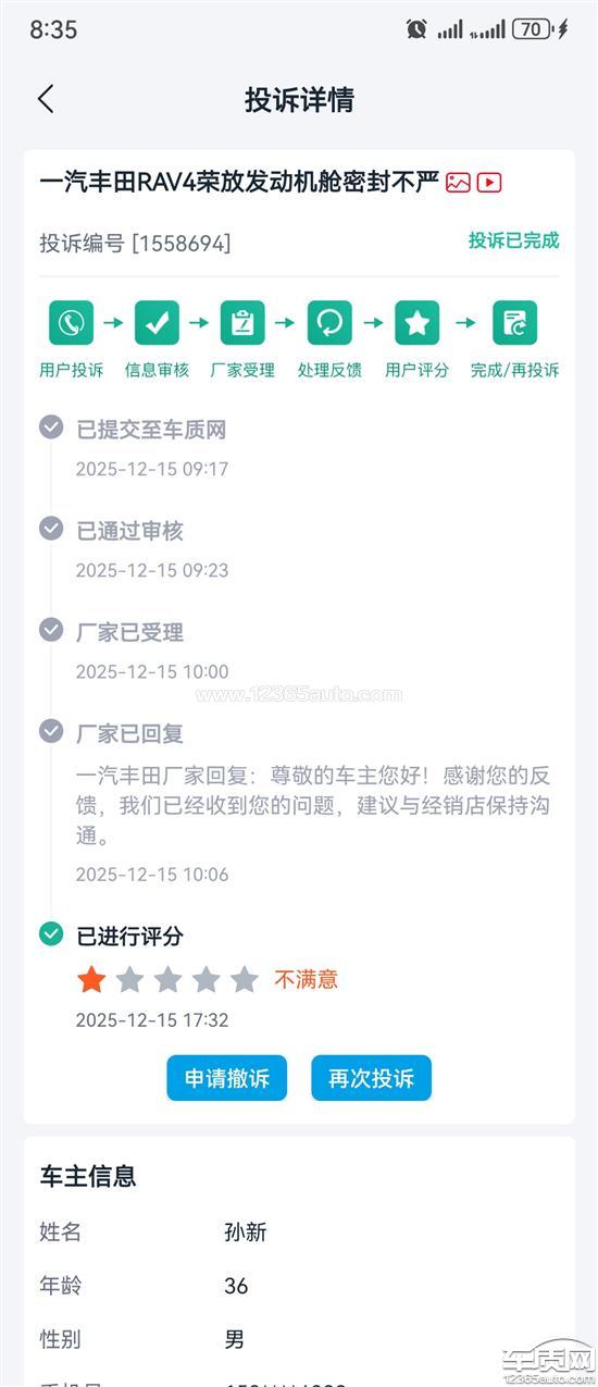 多次投诉无果,厂家置之不理,厂家置之不理,厂家置之不理,发动机舱封闭不严密,大量泥浆会从车轮处进入发动机舱,致使发动机舱内部出现生锈情况。这严重影响到了车辆的耐久性,由此可见,该车存在严重的质量问题。经销商联系我去检查车子了,然后说了句就这玩意,我不明白一汽丰田这么大品牌竟然这么糊弄。车发动机机舱内泥浆很严重已经有生锈现象。希望厂家重视积极正面解决问题,以免发生对自身品牌不利的影响。下一步不排除采取自媒体方式维权。