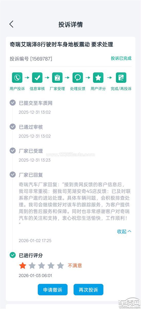 奇瑞艾瑞泽8行驶时车身地板震动 要求处理