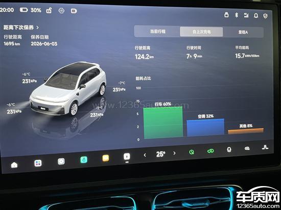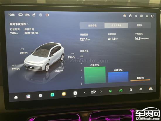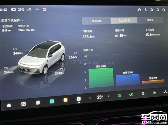 该车辆官方标注续航里程为510公里,冬季充满电(100%)时动态续航显示为304公里。从100%电量开始行驶,实际行驶125公里后剩余电量仅29%,续航达成率约为30%。空调能耗占比高达30%-40%之间。按动态续航计算也需打六折。热泵工作时车内噪音极大,类似飞机舱内的轰鸣声,并伴随方向盘震动。