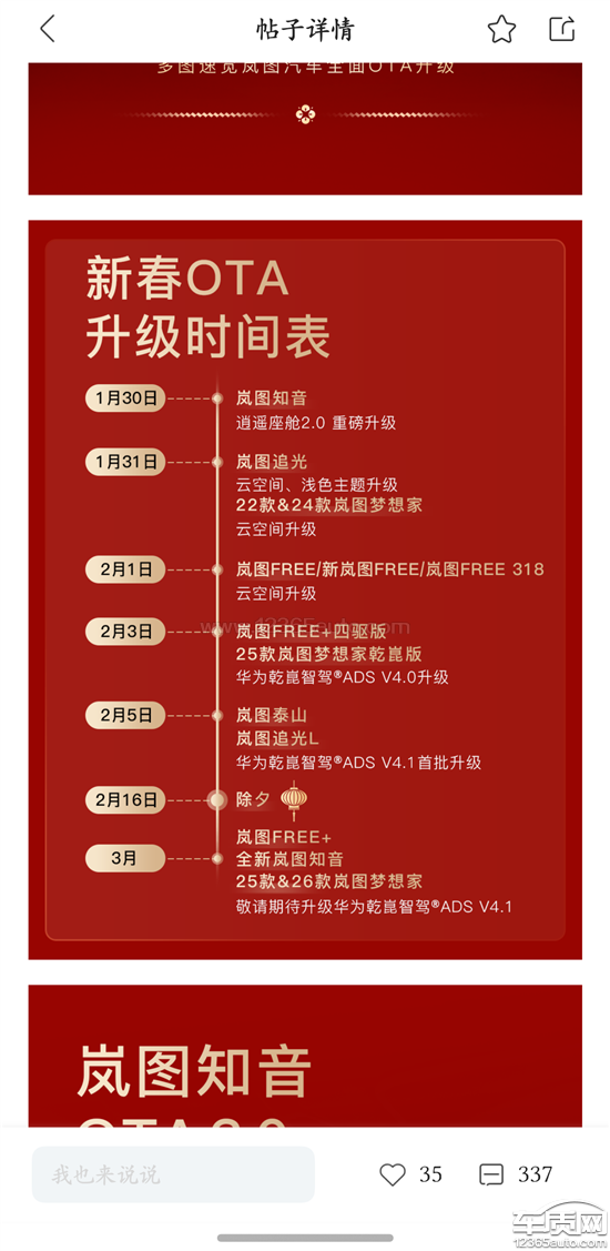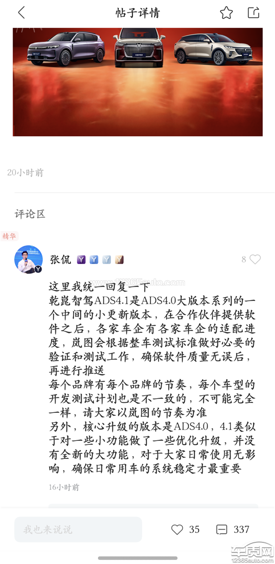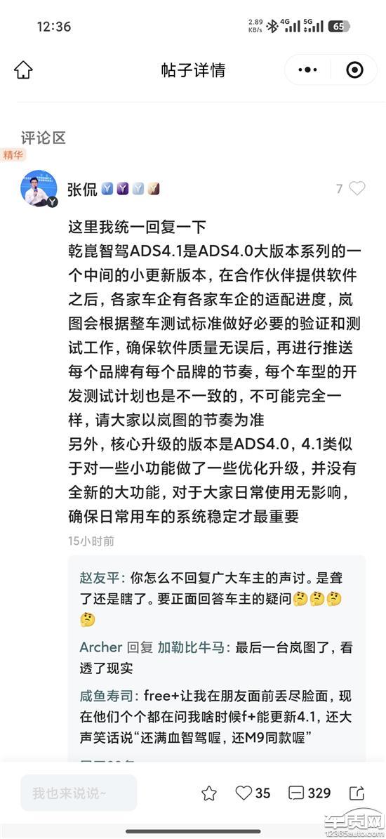 同样花1.2万,追光、泰山计划于2.5进行更新ads4.1,free+为什么不更新,那就不要收1.2万。在华为乾坤app上根本绑定不了岚图的车。要求岚图公开道歉,并进行ads退款岚图ADS4.1跳票:央企“傲慢”劝退支持者当高管开始嘲讽用户,央企的“傲慢”正在劝退它的支持者春节最需要升级的时候,选择嘲讽在竞争白热化的中国新能源汽车市场,技术迭代的快慢决定了生存,而对待用户的态度则决定了长远。岚图高管张侃在面对用户询问时,所表现出的那种令人咋舌的“嘲讽”姿态。撕开了岚图作为“造车国家队”光鲜外表的“央企式傲慢”。一、从“期待”到“被教育”:一场糟糕的公关灾难对于岚图车主而言,ADS4.1不仅仅是一个版本号。面对升级的再次推迟,用户产生焦虑、质疑甚至不满。面对社区内的质疑声,岚图高管张侃的回应并非安抚或诚恳致歉,反而选择了一种高高在上”的姿态。那种带有反讽意味的言论,不仅没有解释清楚技术难题,反而像是在“教用户做事”。在岚图眼中,用户不是需要服务的上帝,而是不懂技术、无理取闹的麻烦制造者。二、硬件的巨人,服务的矮子岚图作为东风汽车旗下的高端新能源品牌,背靠央企雄厚的造车底蕴。岚图的机械素质