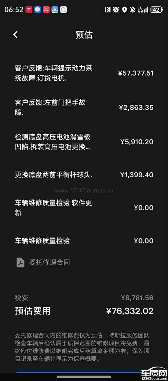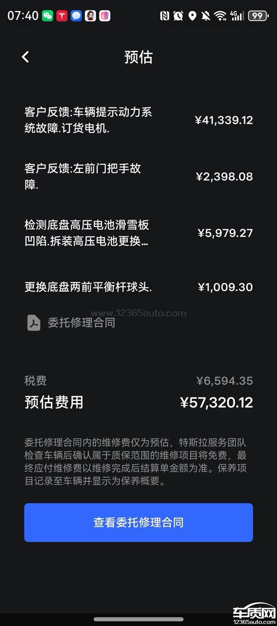 本人是特斯拉十年老车主,车型为特斯拉modelS。2026年1月26号,车辆突然行驶不正常,我将车开至相关服务中心检测,该服务中心经过半天检测后告知我电机损坏,我询问是否可以维修,对方回复只能更换,估价约47000元,同时称还检测到其他五项问题,五项问题维修费用约17000元。车辆未做任何维修,对方收取了我310元检测费,我随后将车开走。1月27号,我致电对方,同意更换电机(费用47000元),并选择维修其他五项中的三项,包括车门把手维修、底盘滑雪板凹陷及底盘平衡杆球头破损,这三项维修报价约11500元,当天我支付了10000元维修定金。2月1号,我将车拖至该服务中心,2月2号早上八点钟,特斯拉APP向我推送了预估总维修费57000元的报价,20分钟后,报价变更为59000元,我同意了该报价,对方承诺2月4号下午修完并开始维修。但当天下午维修过程中,对方又致电告知我,除上述59000元费用外,又发现后桥损坏,需更换,费用约15000元,系统再次推送的总维修报价约76000元。我本不想继续维修,但对方称电机已到货无法退货,我陷入骑虎难下的境地。对方这种诱导式加价行为给我造成了很大困扰,若