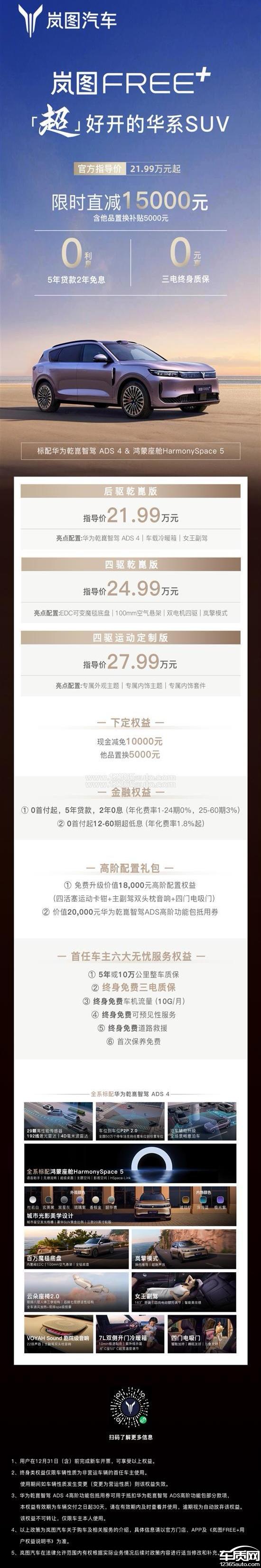 2025年9月25日,我刚提了岚图Free+,满心欢喜还不到两个月,12月3日就看到官方宣布这款车直降15000元,还赠送充电桩和现金补贴红包。算下来,总差价达1万多元!这才提车两个月,车子里程才2000公里,就平白无故贬值这么多,相当于白白损失了一万元。还有,当初我特意花了12000元购买了华为ADS智驾高阶版,官方宣传升级会同步推进。结果,从3.3版本升级到4.0版本,整整延迟了4个月;现在从4.0版本升级到4.1版本,同是华为系的其他车型早就升级到新版本了,岚图Free+却迟迟没有动静,已经延迟了1个月!我花了真金白银购买的服务,却遭到区别对待,官方却一直没给出合理说法。在智驾升级方面,也没有任何官方时间表(其他车型都有),询问客服也只是敷衍了事。作为支持国产新能源的消费者,我们花高价购买新车,可不是为了被“背刺”的!我要求厂家补偿降价差额或等值权益,比如积分、保养服务、延长质保等,不能让老车主为短期降价买单。同时,厂家要明确华为ADS智驾升级的具体时间。