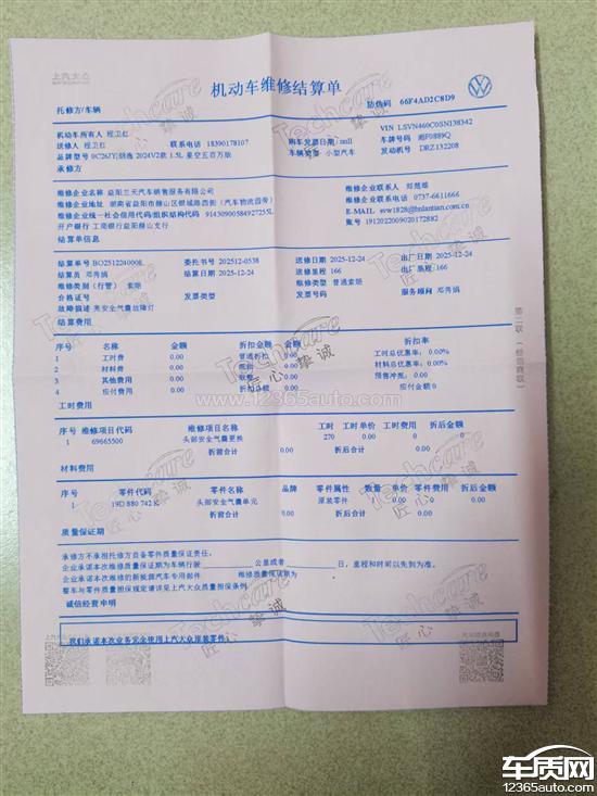 2025年11月14日.在湖南湘阴汽贸购买大众新车,交付中发现车有安全气囊故障,解释是线路问题进行检查维修,到下午1点多没查出原因,在我们不知情的情况下,晚上5点多,汽贸店打电话来说大众益阳兰天4s店来人把车修好了,我们没有提车,车一直在汽贸。12月19月下午,汽贸愿意出具书面说明安全气囊故障已排除,我们去提车,由车管所同志开车去上牌路上,安全气囊故障图标依旧现显,就安全气囊故障同一问题36天没有修好,后来车子于12月24日由汽贸售后经理开到益阳兰天汽车销售服务有限公司进行第二次维修,当天下午益阳兰天汽车销售服务有限公司经理说车已修,并出具书面说明和维修结算单。12月27日,发现安全气囊故障第三次显示,12月28月,益阳兰天与汽贸沟通,由汽贸对车进行电脑消码,12月30日,安全气囊故障第四次显示,1月2月进行维修。期间我们多次审请退车均遭拒绝,也多次向贵网反馈情况,都未收到厂家答复。这车存在安全质量问题连续多次出现!望考虑消费者人身安全,根据三包法,退换车辆。