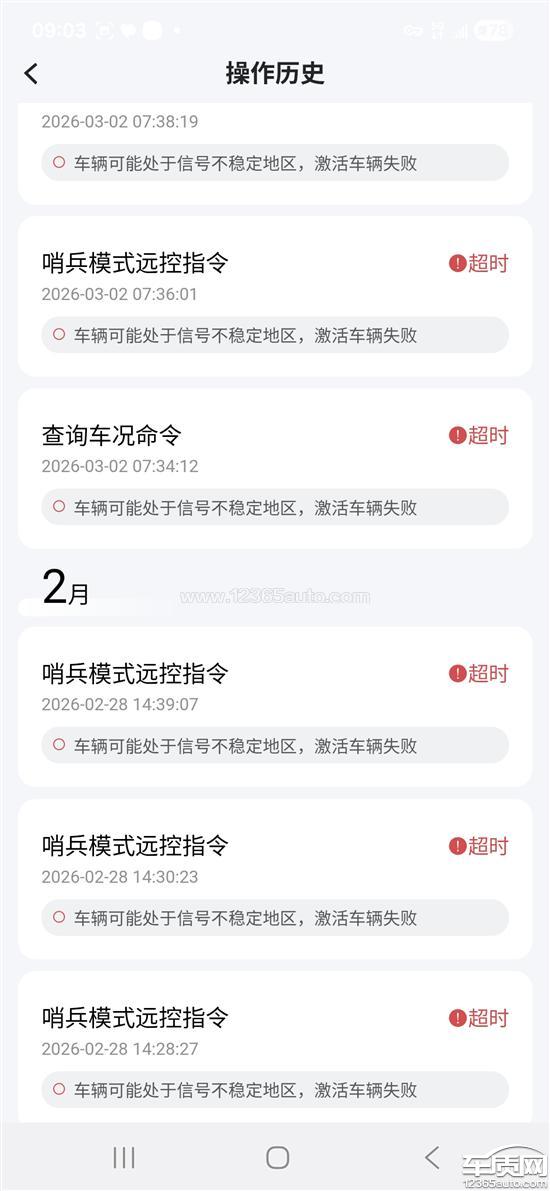 自2月底起,手机控车APP除蓝牙功能外所有远程操控功能失效,包括查看车况、远程监控、哨兵模式、远程备车及车辆预热等。具体显示为“车辆处于信号不稳定地区,功能激活失败”。经本人亲自测试,车辆无论位于小区内还是外部停车场均无法正常激活APP远程功能。此前停放在相同位置时功能可用,问题自2月底出现。特此投诉,恳请厂家或店家协助解决。