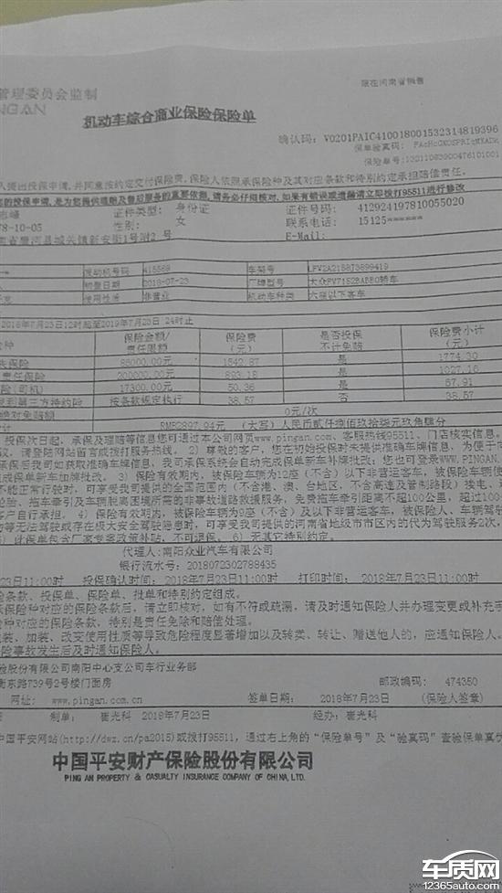 5999元保险,给了4000元保单。车损险保单上1700多元,可当时对我说2600多元。