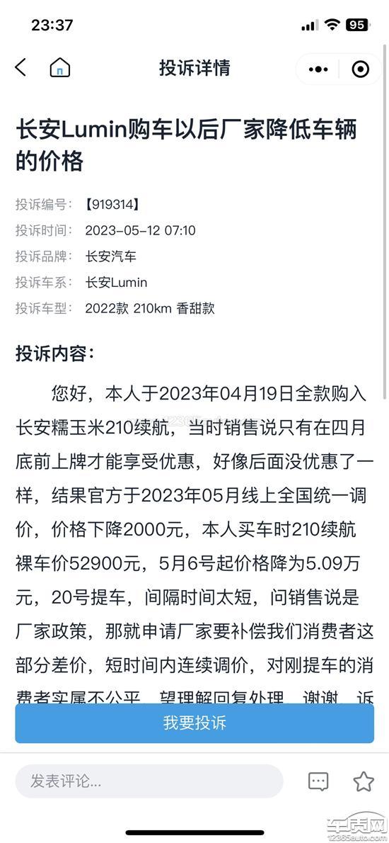 本人于5.8号订下糯玉米210续航车辆,并签订合同,于5.10号晚七点左右签合同付尾款,但并未上牌,第二天11号早上发现官网活动海报显示5.6-5.31降价4000元,我本人无论是订车还是尾款都在活动时间内,于是联系销售及厂家,但他们一口咬定要11号之后订车的客户才可以享受服务,与官网发布活动内容相违背,我要严重投诉该厂家这种恶心人的行为,刚签完合同几个小时就不认账了,还故意踢皮球推卸责任,我要求长安糯玉米厂家给予我相应补贴资金,退还属于我的优惠金额两千元,12315已受理,我的投诉厂家也迟迟不肯给予正面回映,长安如果不给个说法,我要投诉到底!